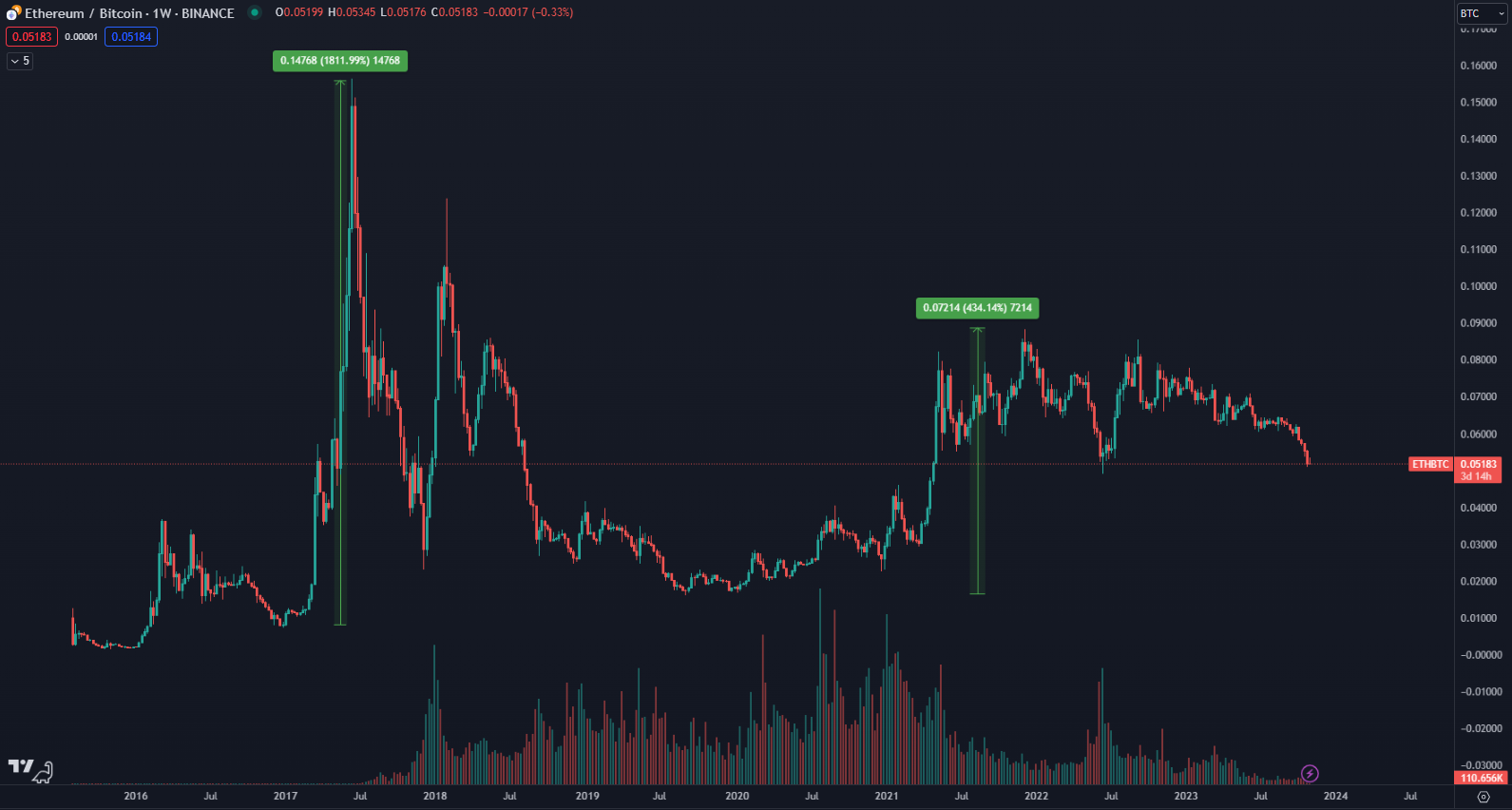A prečo by mala cena v roku 2024 stúpať? Bitcoin predstavuje vstupnú bránu do bullrunu. Inak povedané, ak kryptomeny vstupujú do fázy rastúceho trendu, najprv rastie Bitcoin a až následne altcoiny. Práve v podobnej fáze sa momentálne nachádzame. Vďaka halvingu každý očakáva, že kryptomeny v roku 2024 porastú. V pokročilej fáze by sa však mali zisky z Bitcoinu presúvať do altcoinového trhu. A história nám už ukázala aké zisky dosahuje Ethereum oproti Bitcoinu.