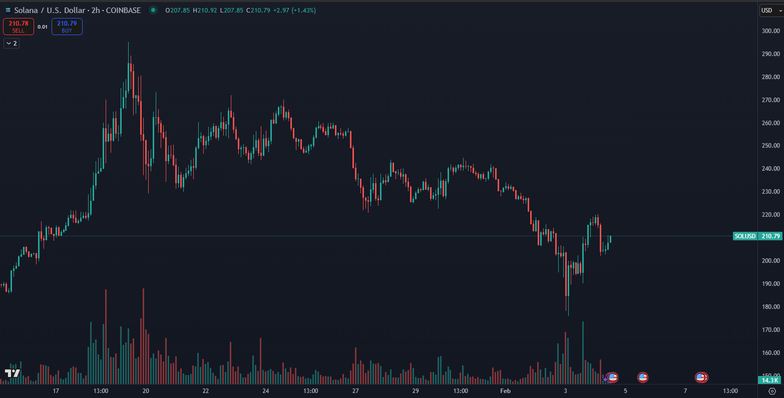 SOL testovala podporu pri hodnote 194 dolárov pred odrazom nahor. Najbližší odpor sa nachádza okolo úrovne 220 dolárov, kde sa v minulosti objavoval významný predajný tlak. Pre ďalší rast bude kľúčové prekonanie tejto úrovne.