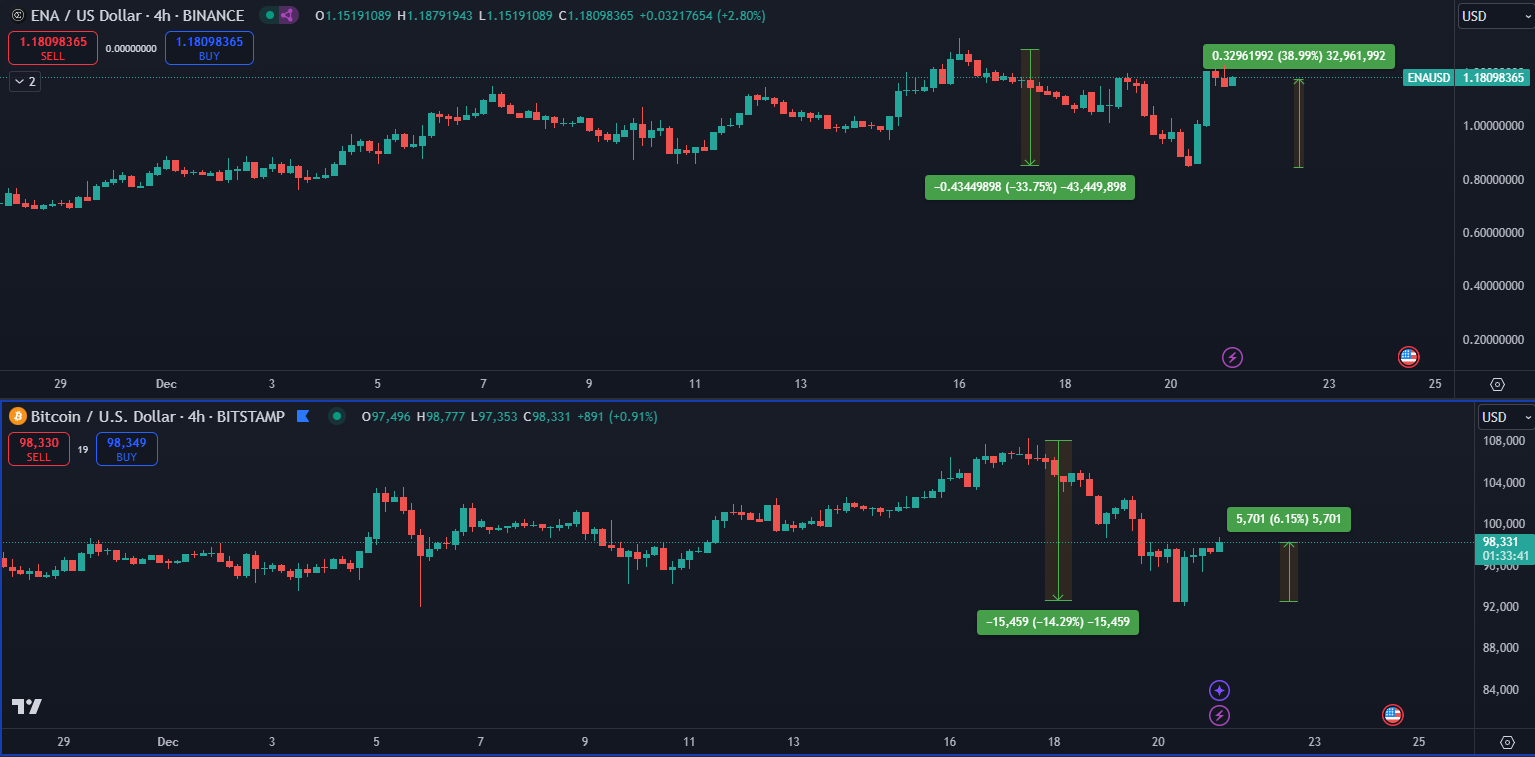 Na grafe nižšie môžeme vidieť porovnanie cenovej výkonnosti Bitcoinu a kryptomeny Ethena (ENA). Korekcia na strane ENA bola síce o 20 % vyššia, no zároveň odraz bola taká volatilná, že vymazala celý predošlý pád. Na rozdiel od toho Bitcoin stúpol len o 6 % a ani zďaleka sa nepriblížil predošlému maximu, ukazujú údaje TradingView.