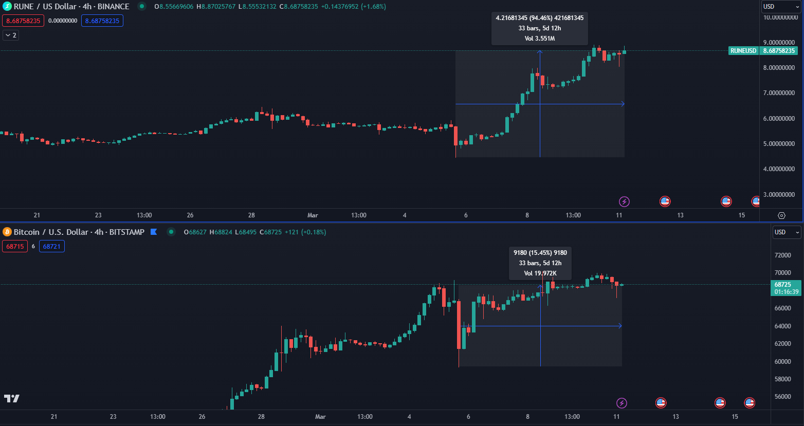 Nedeje sa často, že kryptomena dokáže urobiť zhodnotenie 100 % len za pár dní. RUNE to dokázal, keďže od 5. marca stúpol dvojnásobne, zatiaľ čo Bitcoin za rovnaké obdobie narástol len o 15 %. Dokonca aj väčšina kryptomien, ktoré narástli viac ako Bitcoin, sa nechytajú na rýchle zhodnotenie kryptomeny RUNE.
