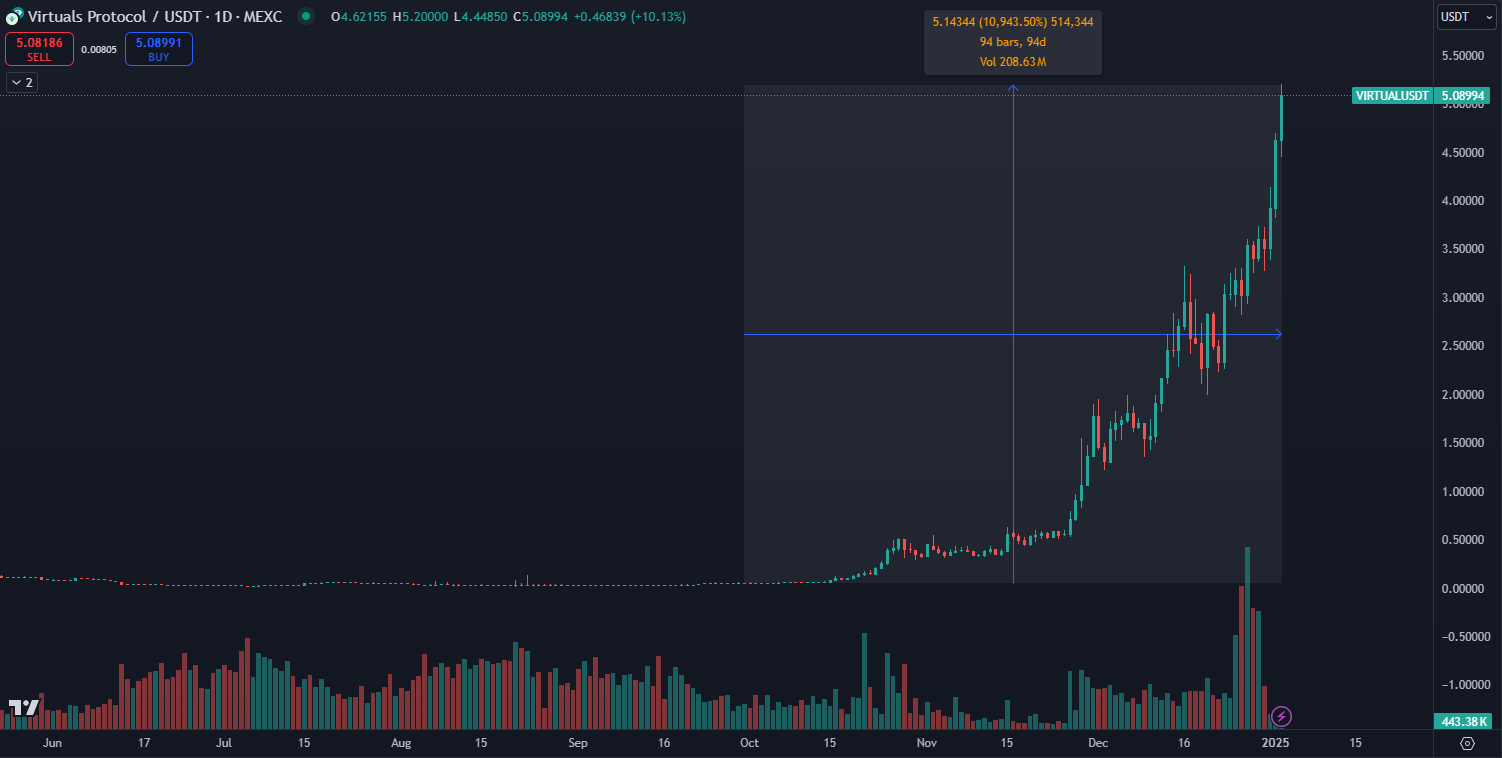 Virtuals Protocol (VIRTUAL) sa obchoduje na historickom maxime uprostred korekcie širšieho trhu na cene vyše 5 dolárov. Táto kryptomena dokázala narásť o neuveriteľných 11 000 % len za 3 mesiace a priniesla držiteľom rozprávkový zisk. Nedávno sme vás informovali, že vďaka VIRTUAL zarobil obchodník s prezývkou trezor538 až 5 000 %.