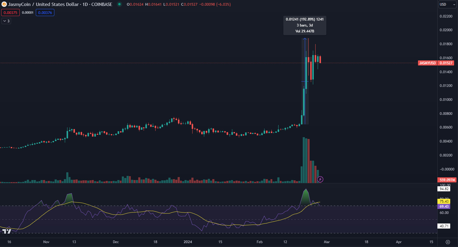 Nedávno digitálna mena Jasmy zatienila ostatné kryptomeny a dokázala stúpnuť len počas 3 dní o neuveriteľných 200 %. Zdá sa, že rastúca dynamika musí dočasne vychladnúť, no následne by trend mohol pokračovať smerom nahor. Vďaka poslednému nárastu sa kryptomena na chvíľu dostala do rebríčka top 100 kryptomien podľa trhovej kapitalizácie na stránke CoinMarketCap.