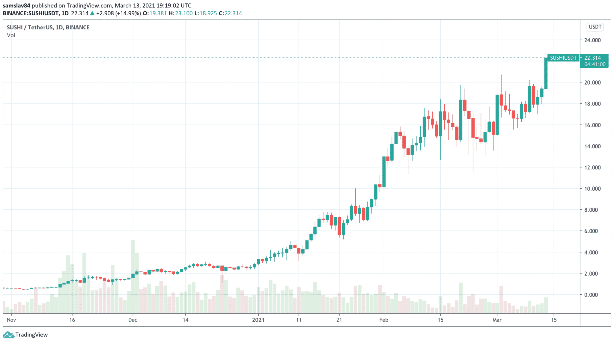 Token SUSHI od novembra stúpol na 30-násobok pôvodnej hodnoty a aktuálne sa na burzách obchoduje za 22,4 dolárov s denným ziskom 16,7%.