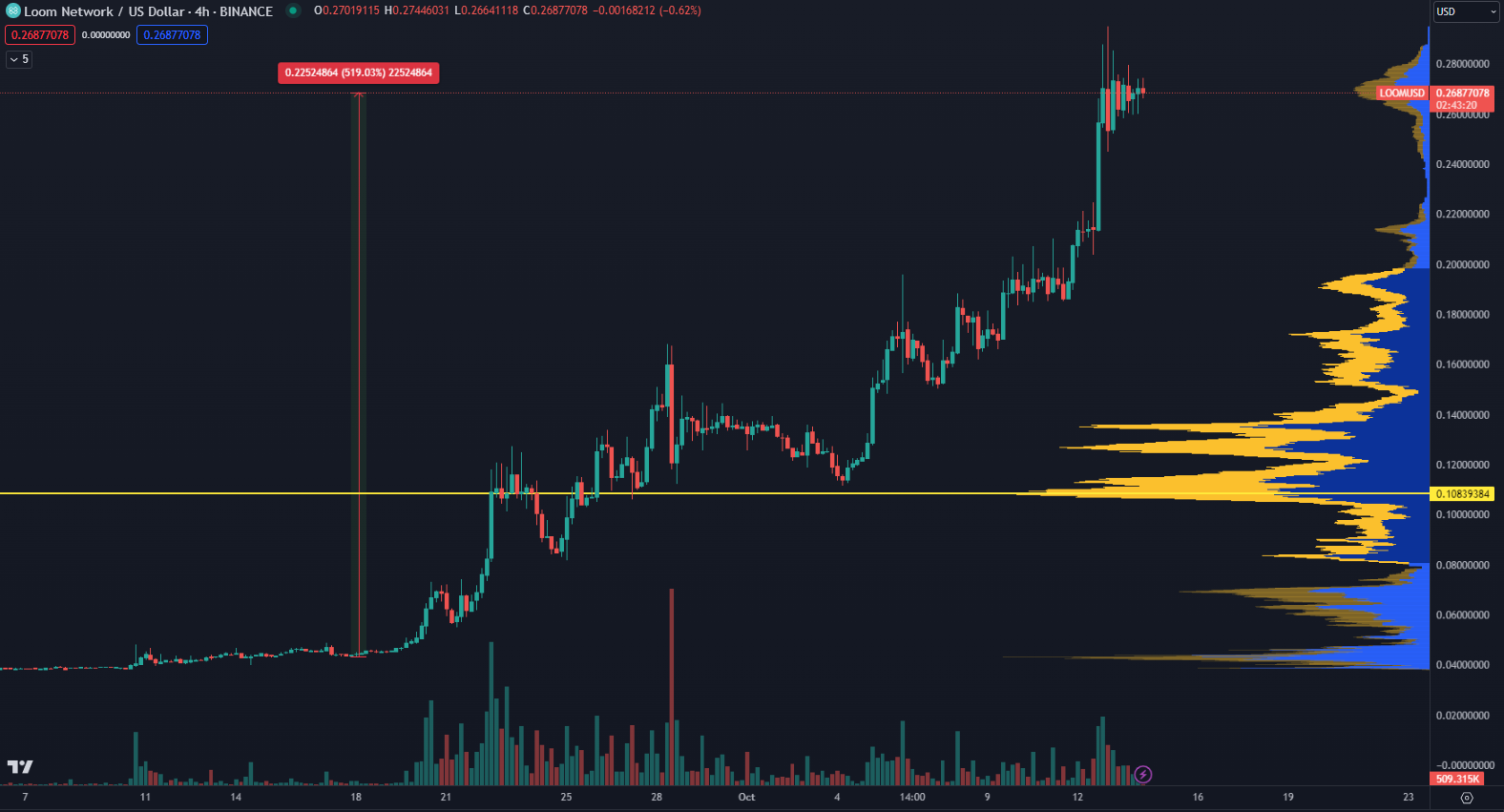 LOOM pomerne často vytvára denný vysoký zisk, no väčšinou na druhý deň sa celý vymaže. Stalo sa tak napríklad v marci 2023 alebo septembri 2022. Teraz však cena rastie konzistentne už štvrtý deň po sebe a zároveň sa obchoduje najvyššie od júla 2018, keďže prekonala maximum z marca 2021. Obchodné objemy taktiež stúpli, no nie tak výrazne ako pri posledných spomínaných cenových vzostupoch. Zatiaľ čo 18. septembra 2023 sa cena nachádzala na úrovni 0,043 dolára, v súčasnosti je to už 0,269 dolára.