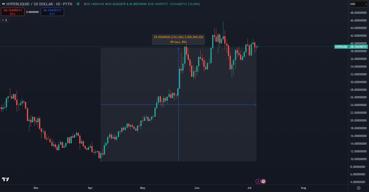 Cena HYPE sa obchoduje na úrovni 39,17 dolára, pričom historické maximum bolo dosiahnuté 16. júna 2025 na úrovni 45,77 dolára. Kryptomena však za posledné 3 mesiace zaznamenala rast o vyše 300 %.