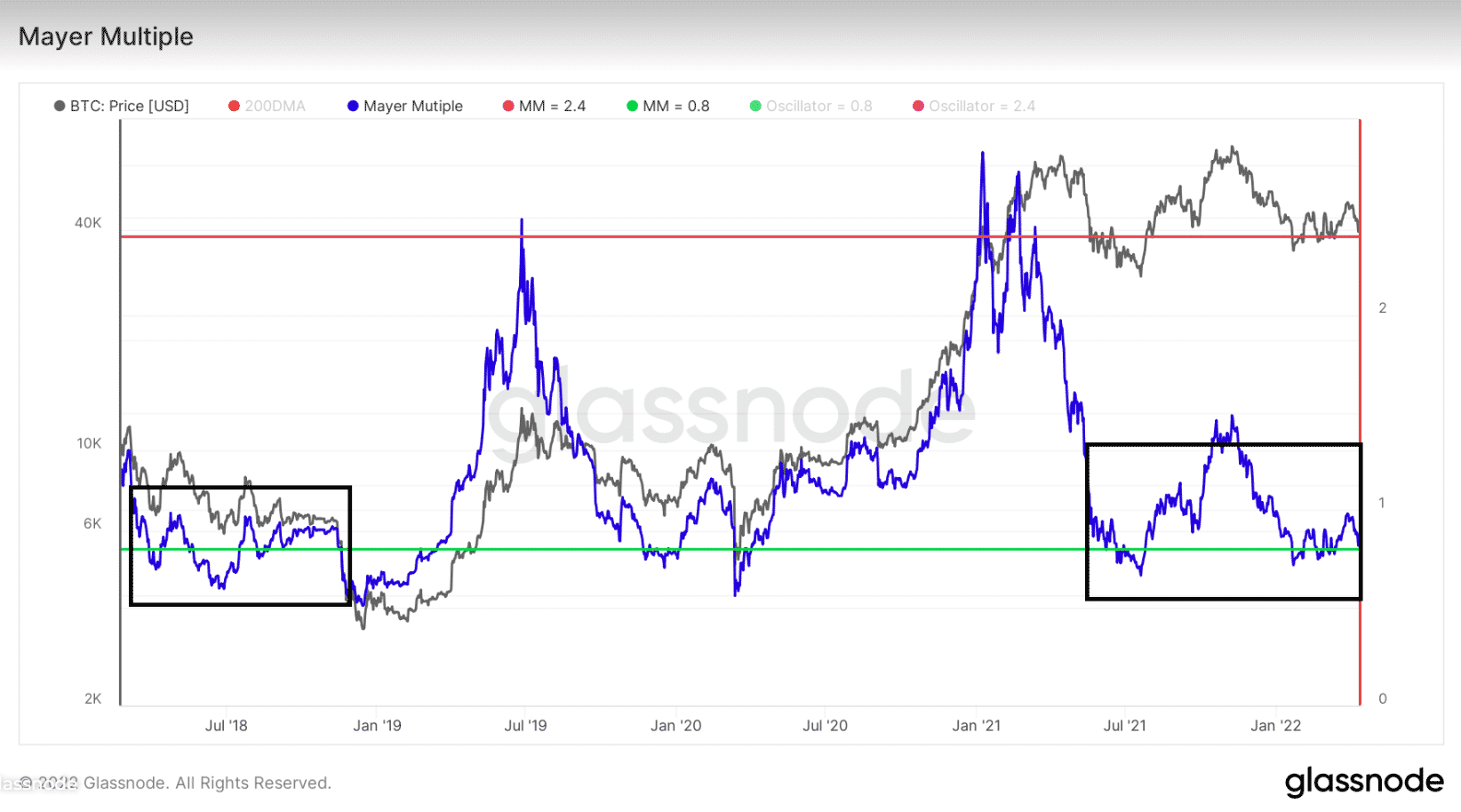 Mayer Multiple je on-chain indikátor. Používa sa na určenie trendu a používa pomer medzi cenou BTC a jeho 200-dňovým kĺzavým priemerom (MA). Momentálne indikuje dno pre Bitcoin a jeho korekciu.