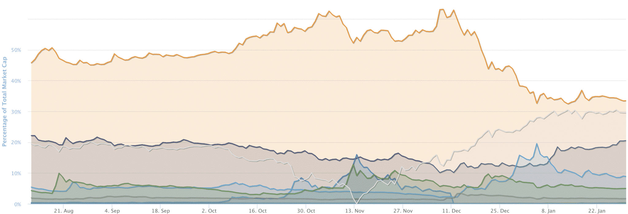 Posledný mesiac minulého bullrunu bol naozaj zvláštny. Bitcoin viac menej stagnoval, zatiaľ čo ostatné (vrátane tých najväčších shitcoinov) robili obrovské zisky. Pre ilustráciu prikladáme graf Bitcoinu, Etherea a dominancie.