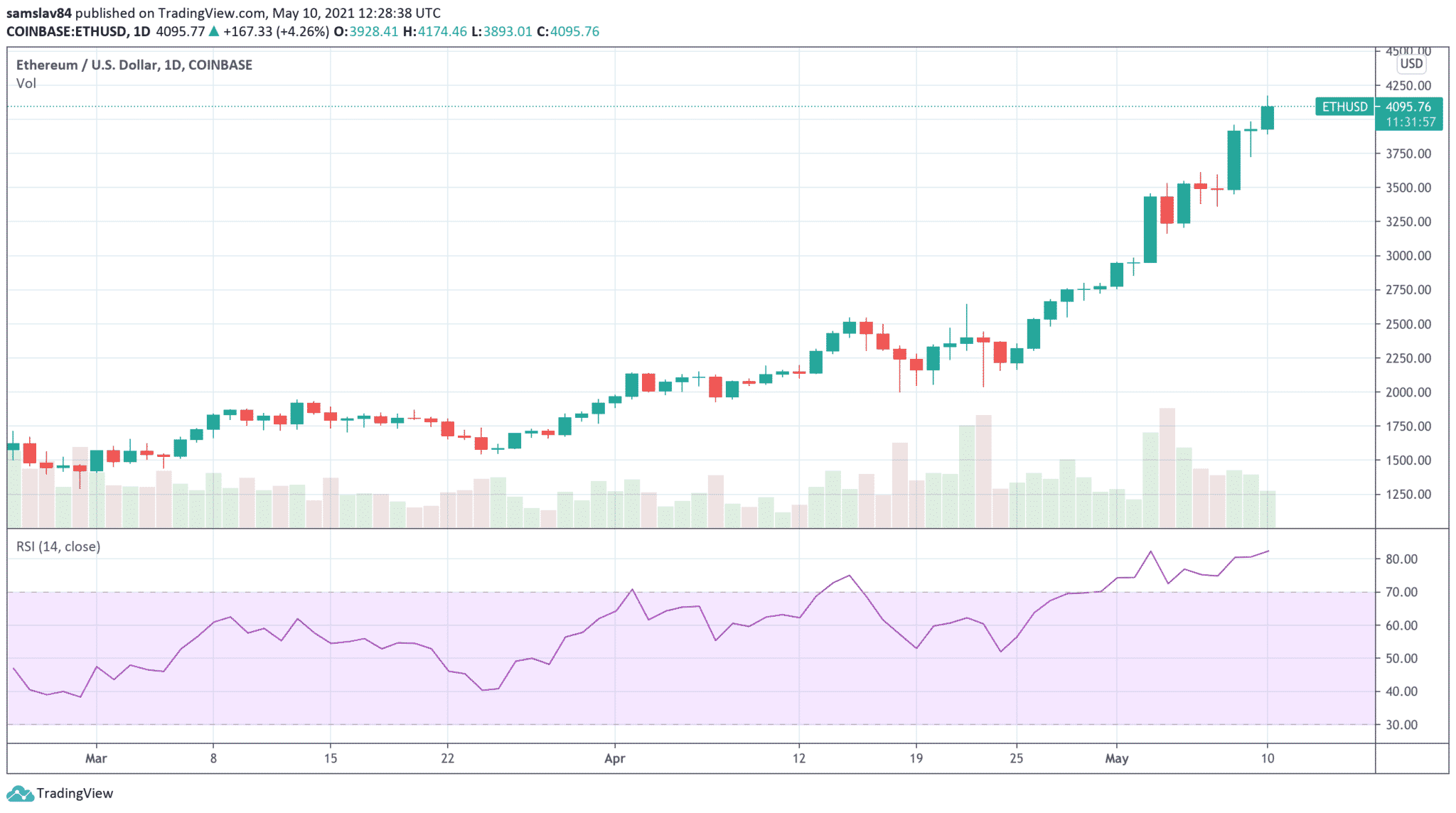 Avšak Bitcoin v posledných mesiacoch ani zďaleka nestačí na ostatné kryptomeny. Zabudnime na Dogecoin DOGE a podobné blbosti a zamerajme sa iba na Ethereum. Hodnota tohto coinu dnes prekonala 4000 USD a kapitalizácia etheru sa blíži k pol biliónu dolárov (500 miliárd). Iba za posledný týždeň hodnota Etherea stúpla o 30%, zatiaľ čo Bitcoin je mierne v mínuse.
