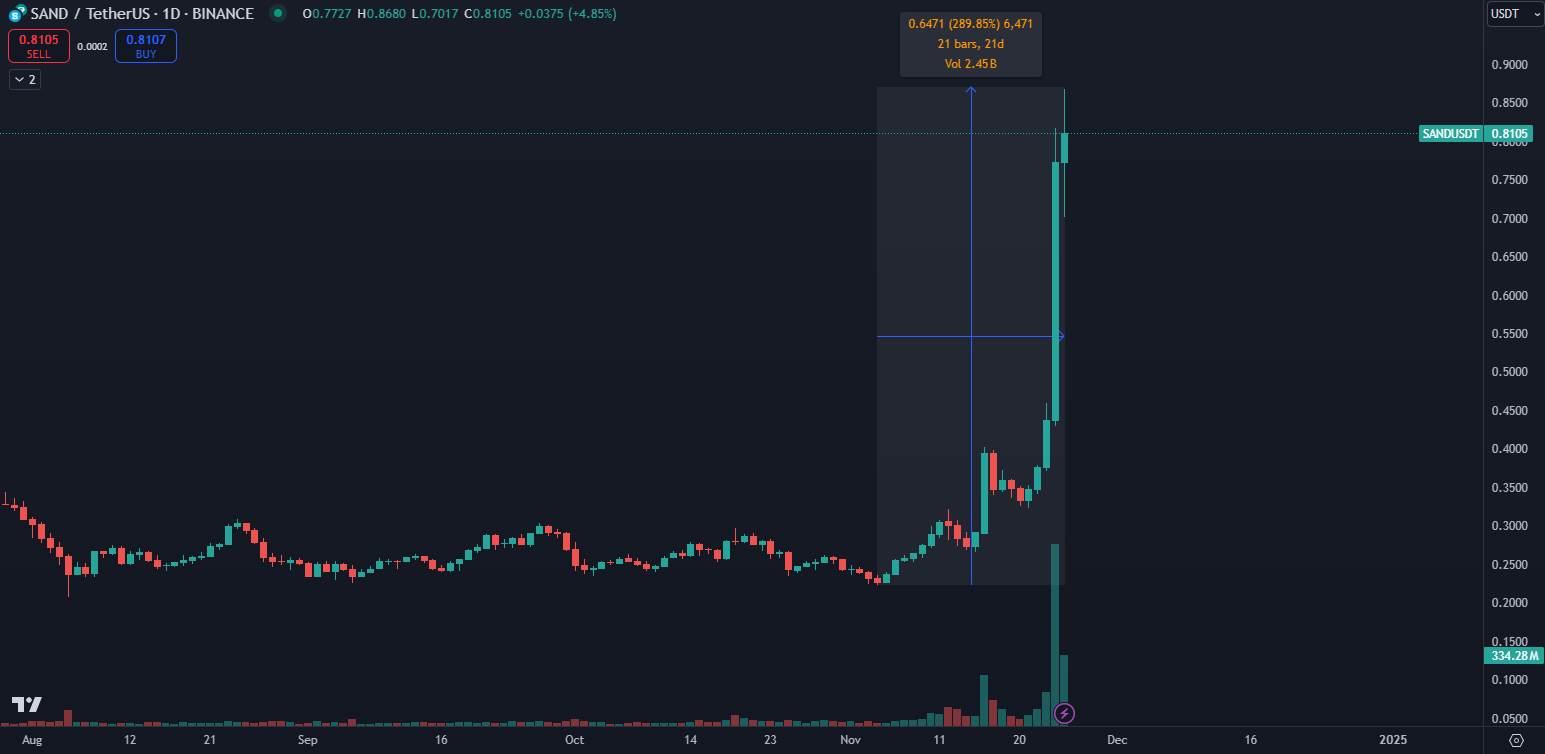 - Na čele tohto trendu stojí kryptomena Sandbox (SAND).