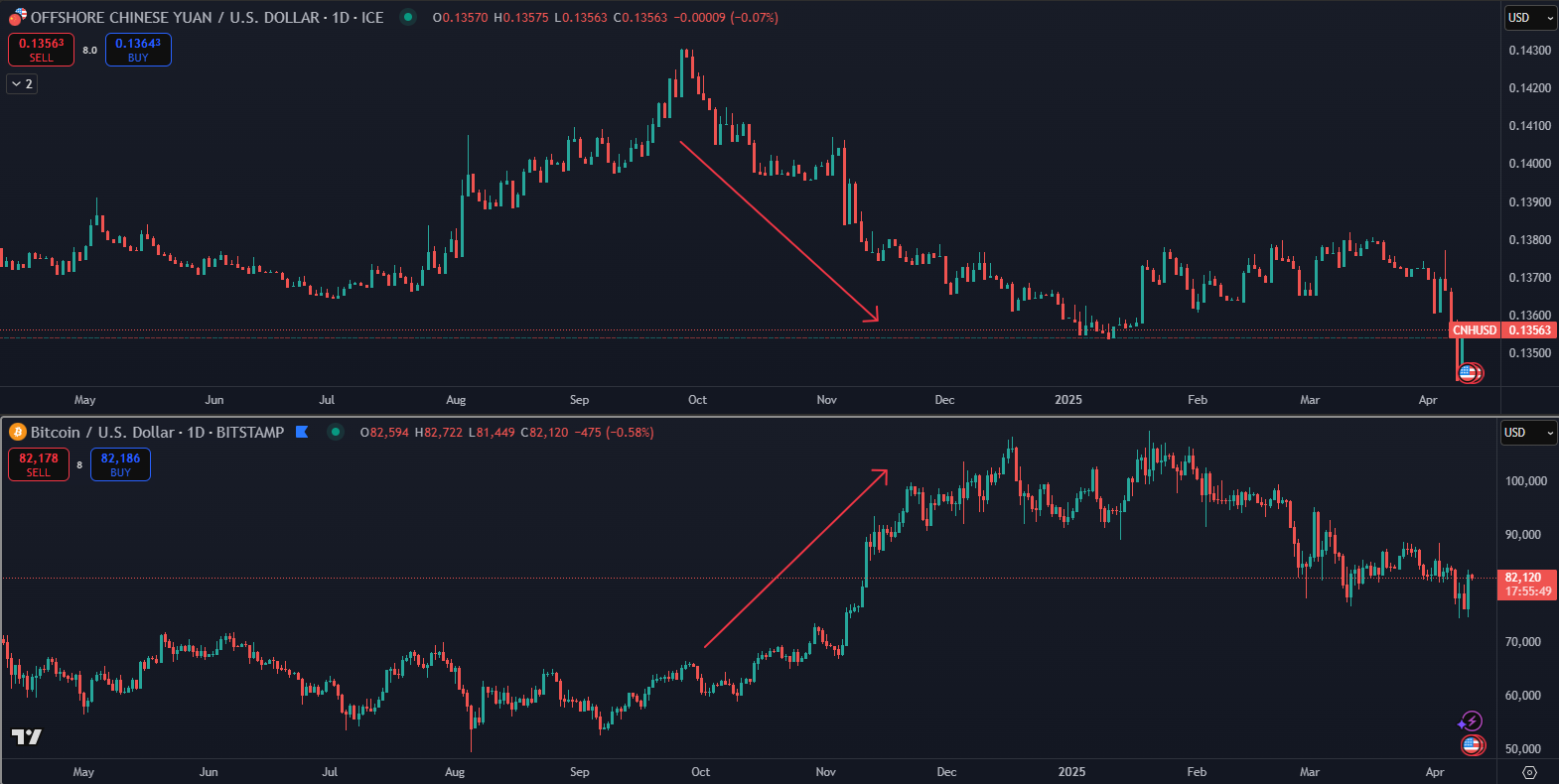 Keď kurz amerického dolára voči čínskemu juanu (USDCNH) vyskočil na 7,3472 – čo predstavuje nárast o 1,67 % oproti jeho uzavretiu 11. marca na úrovni 7,2268 –, Hayes poukázal na Ľudovú banku Číny (PBOC) ako na potenciálny katalyzátor rastu pre Bitcoin.