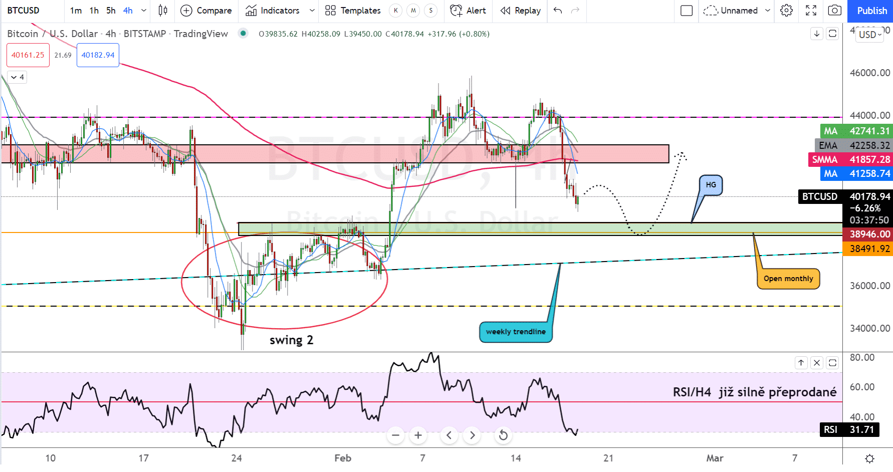 Cenová hladina 38 946 $ ukrýva na weekly HG (hidden gap), takže možno uvidíme ešte pretrvávajúci tlak predajcov až k tejto hodnote HG. Teraz budem čisto špekulovať a poviem, že si myslím, že dôjde k uzavretiu Gap úrovne a cena tu otočí. Nedôjde tak na retest viditeľnej vzostupnej trendline a následne uvidíme obrat a možno aj silný rast k hladine 44 000 $. Pásmo okolo HG je pre kupcov zaujímavé aj preto, že o 455 $ nižšie, presne na hodnote 38 491 $, sa nachádza open monthly sviece. Tu teda skutočne môže prísť silná nákupná aktivita, túto oblasť si rozhodne vyznačte do grafu zelenou farbou.