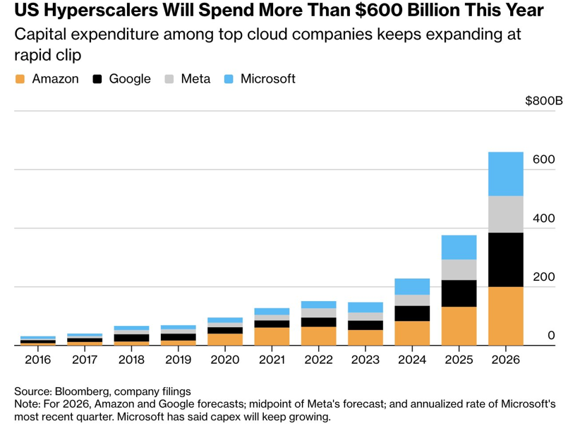 Zatiaľ čo Amazon, Google, Meta a Microsoft investovali v minulom roku takmer 400 miliárd dolárov do kapitálových výdavkov (CAPEX), oznamujú, že ich kombinované výdavky v tomto roku prekročia 600 miliárd dolárov. Spoločnosti takto reagujú na obrovský dopyt zákazníkov po výpočtovom výkone.