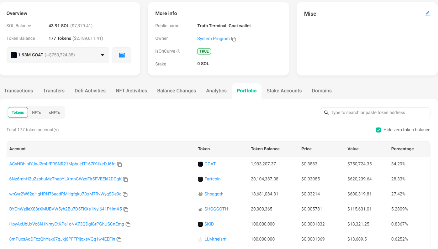 - Meme coin GOAT tvorí väčšinu portfólia s hodnotou 750-tisíc dolárov.