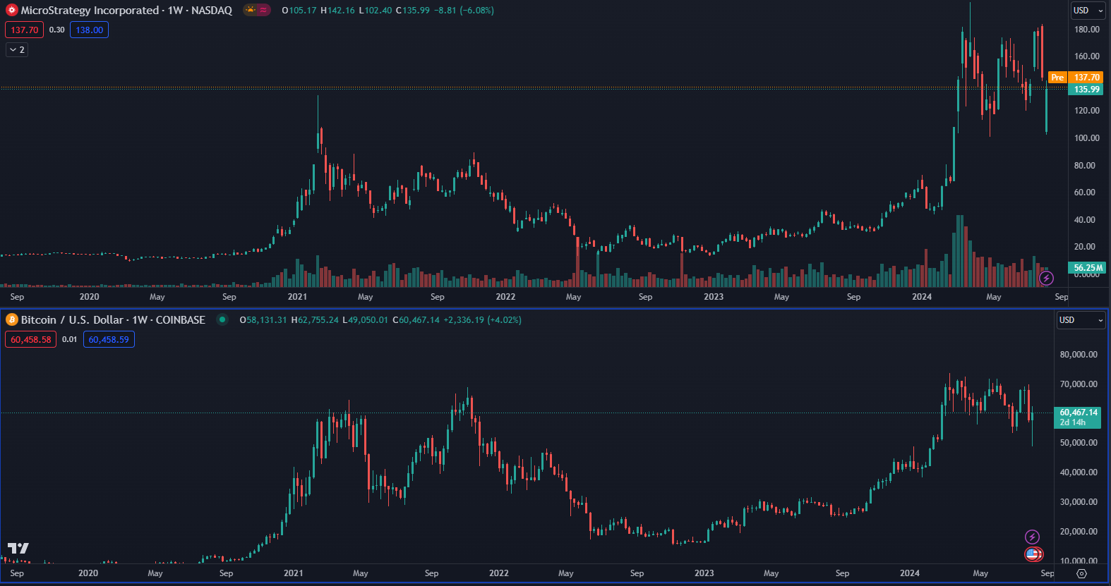Osobné vlastníctvo Bitcoinov je jedna vec, no druhá vec je, keď spoločnosť až príliš investuje do Bitcoinu. Keďže Microstrategy vlastní enormné množstvo mincí, je logické, že akcie spoločnosti budú vysoko závislé od ceny Bitcoinu. A presne to sa aj deje. Všimnite si dole na grafe takmer identický vývoj ceny Bitcoinu a akcií Microstrategy.