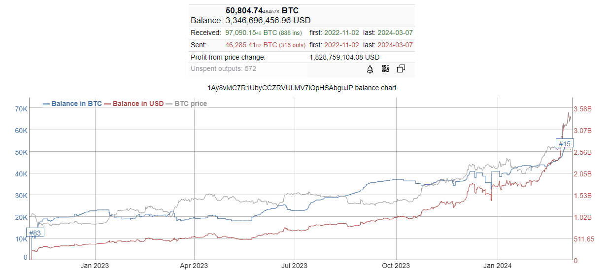 Je zaujímavé, že na prelome rokov 2023 a 2024 mala peňaženka približne 40 000 BTC a dva mesiace neskôr je to už vyše 50 000 BTC. To znamená, že akumulácia prebieha aj napriek vysokému zhodnoteniu trhovej ceny Bitcoinu v úvode tohto roku. Zároveň poukazuje na to, že investori pevne veria v budúci rast najväčšieho digitálneho aktíva na svete.