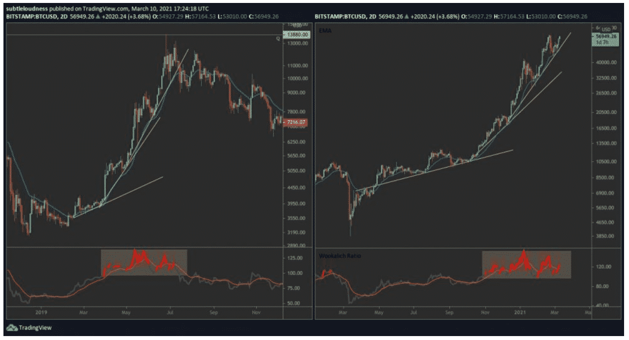 Dynamika súčasného trendu taktiež klesá, aj keď len mierne, ale fraktál z roku 2019 by mohol naznačovať, že Bitcoin môže čeliť majoritnej korekcii. Obidve rasty začínali s trendovou čiarou, ktorá nakoniec smerovala čoraz viac vertikálne. Na vrchole paraboly je veľké odmietnutie, neúspešné opakované testovanie a zlyhanie.