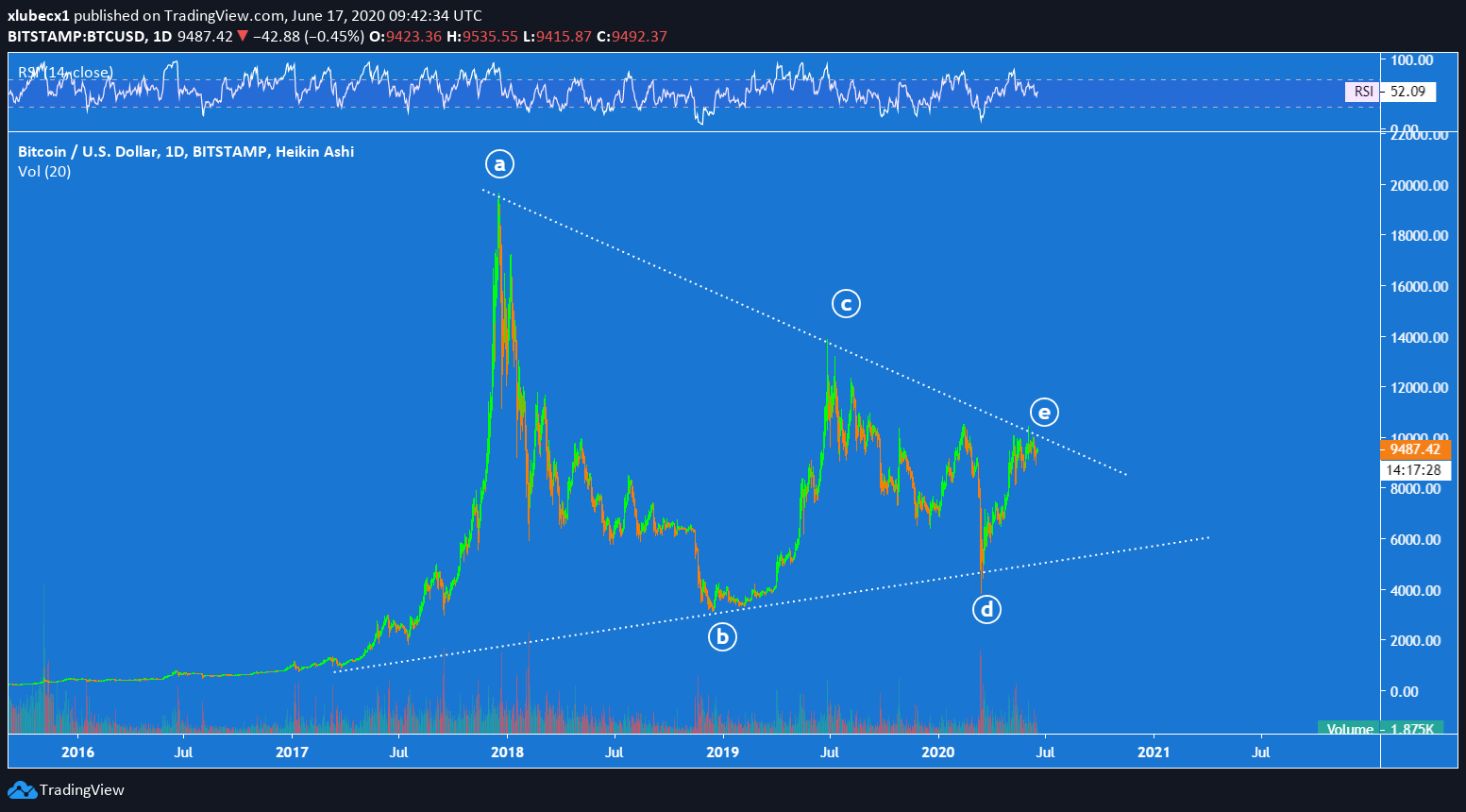 Od roku 2017 sa na daily BTC grafe tvorí veľký symetrický triangel, ktorý by mal byť definitívne dokončený v priebehu roka 2021. Dovtedy sa ešte môže BTC pomerne dlho držať na hodnote okolo 6 000 USD. Aby sme mohli vstupovať do obchodu, potrebujeme v prvom rade vidieť buy signál, ktorý sa objaví iba za okolností, že zlomíme silnú trend line na 10 500 USD. Ak by sa tak stalo už počas tohto mesiaca, tak na 90 % môžeme skonštatovať, že sa začal nový bullish trend na BTC a aj altcoinoch. O triangli, ktorý sa tvorí na BTC som hovoril aj v nedeľňajšom videu.