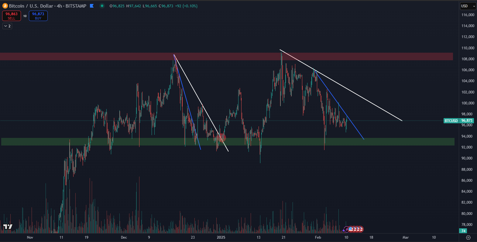 Bitcoin už dva a pol mesiaca pokračuje v bočnej štruktúre a obchoduje sa medzi 91 000 a 109 000 dolármi. Táto štruktúra sa nachádza tesne pod historickým maximom, čo naznačuje, že prípadná rastúca vlna by znamenala dosiahnutie takej ceny, akú sme ešte nikdy nevideli. V tomto článku sa pozrieme na krátkodobú analýzu na základe údajov TradingView.