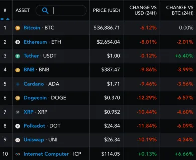 Bitcoin prepadol v priebehu jedného dňa z ceny 39 500 USD až na 36 250 USD. Samozrejme stiahol zo sebou aj ďalšie coiny ako Ethereum (ETH), Binance Coin (BNB), Cardano (ADA) a dokonca aj Muskov obľúbený coin Dogecoin (DOGE).