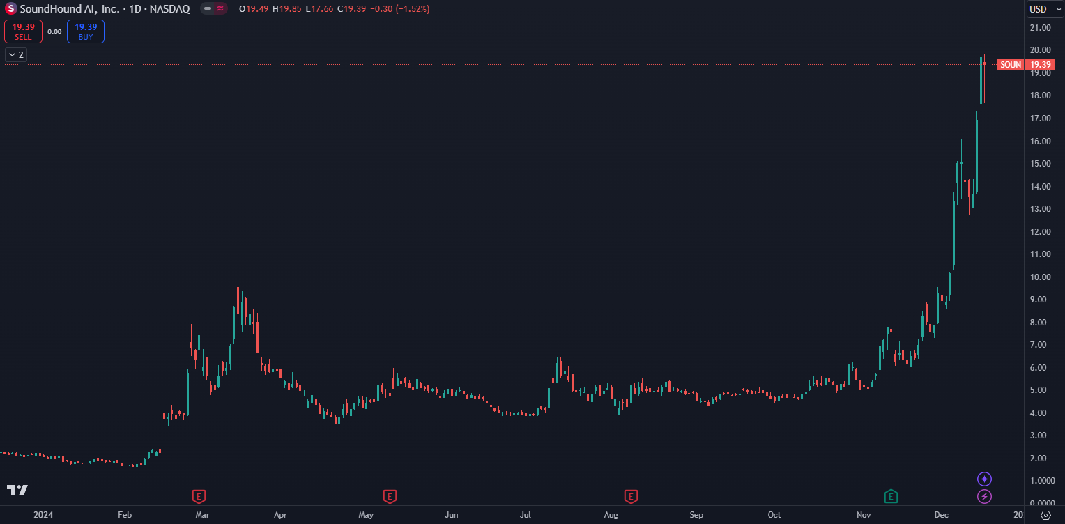 Technologická spoločnosť SoundHound AI (NASDAQ: SOUN) sa v priebehu posledného roka vypracovala na jedného z najdynamickejších hráčov v technologickom priestore, pričom jej akcie zaznamenali v tomto roku podľa údajov TradingView fenomenálny nárast o 712 %, obchodujúc sa momentálne na úrovni 16,39 dolára.