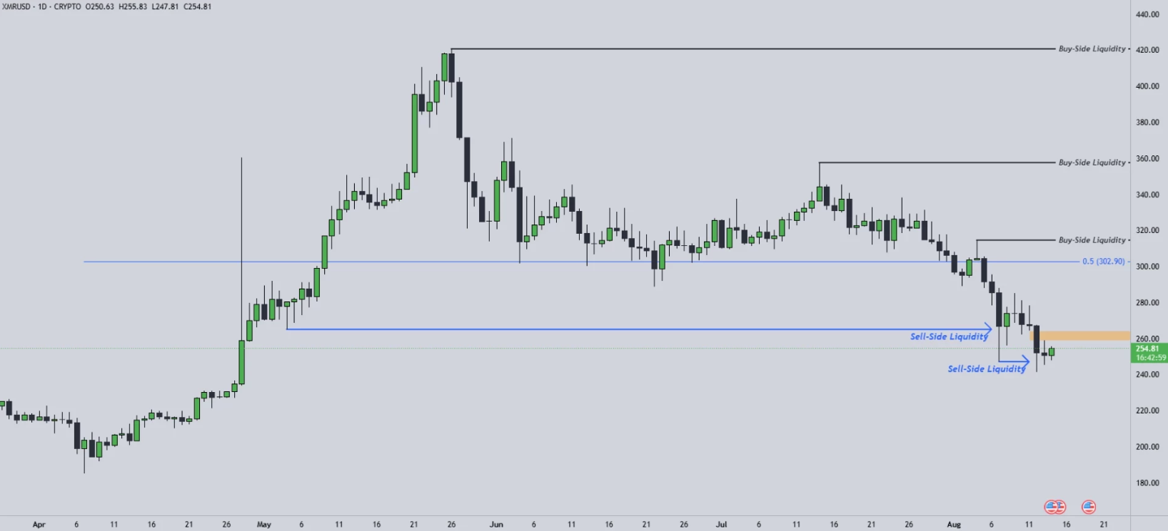 Monero (XMR) za posledný rok zaznamenalo výrazný rast približne o 120 %, hoci posledné dva mesiace prebiehala korekcia. Podľa analytikov BITmarkets sa cena ocitla pod úrovňou 0,5 Fibonacciho retracementu, čo môže predstavovať vhodnú zónu na akumuláciu. Odstránenie likvidity dvakrát na dennom časovom rámci signalizuje potenciálnu príležitosť pre dlhé pozície.