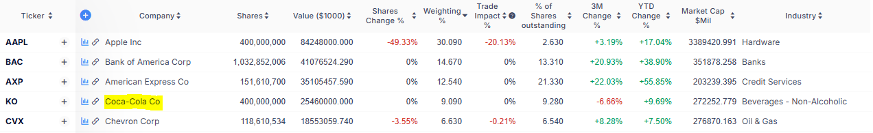 Warren Buffett si prostredníctvom svojej investičnej spoločnosti Berkshire Hathaway udržiava významný strategický podiel v Coca-Cole. Tento podiel podľa údajov Guru Focus v súčasnosti predstavuje štvrtú najväčšiu investičnú pozíciu v jeho rozsiahlom portfóliu s celkovým podielom 9,1 % (400 miliónov akcií v hodnote vyše 25 miliárd dolárov).