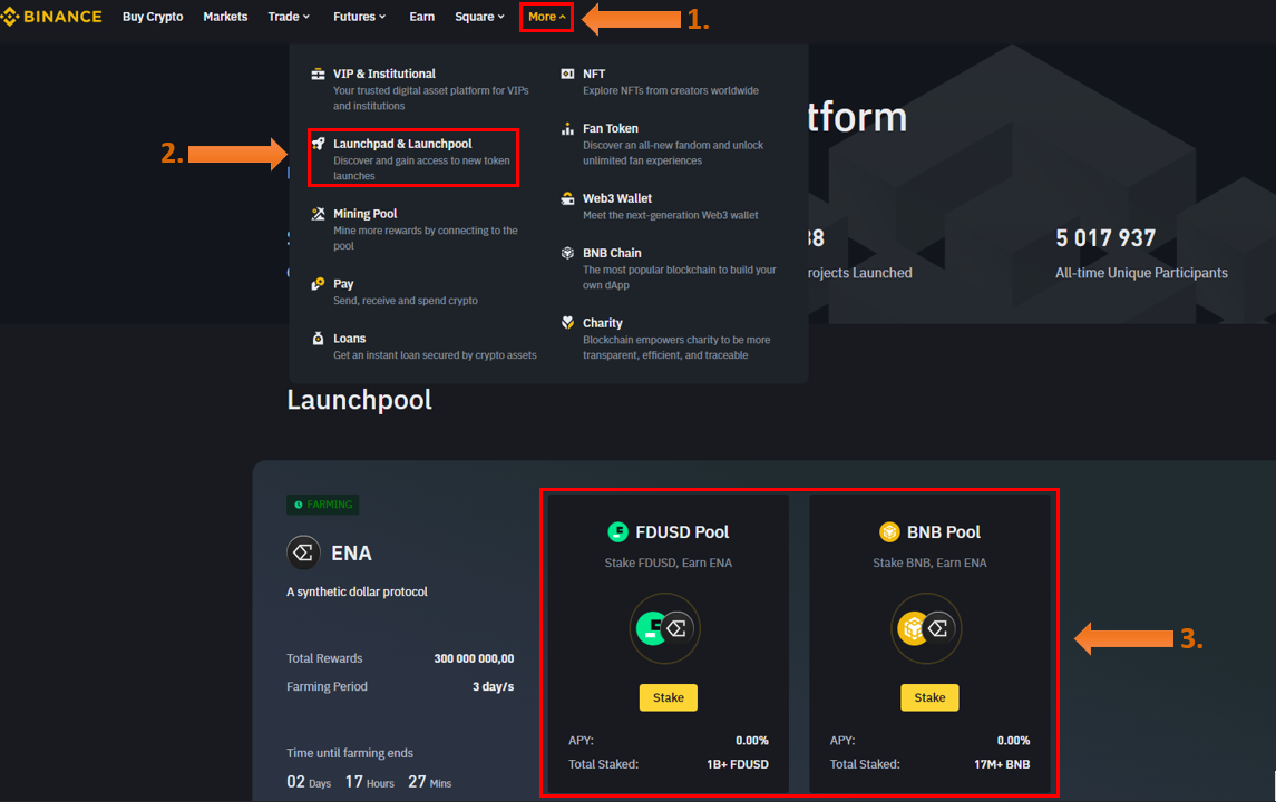 Najväčším nákupom je kryptomena ETHFI, ktorá slúži na likvidný restaking na Ethereu, ktorý pomáha maximalizovať používateľom odmeny. Nedávno ste túto kryptomenu mohli získať v launchpoole na Binance jednoduchým stakingom BNB alebo FDUSD. Na Binance launchpoole boli spustené aj ďalšie kryptomeny, ktoré nakupoval investor. Jednoduchý postup, kde nájdete launchpool, je na obrázku nižšie.
