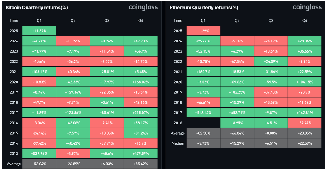 Bitcoin a Ethereum dominujú trhu už tradične v prvom štvrťroku, po ktorom zvyčajne nasleduje obdobie konsolidácie. Historické dáta ukazujú, že Bitcoin pravidelne dosahuje nárast o 53 % v tomto období, zatiaľ čo Ethereum prekonáva očakávania s ešte impozantnejším nárastom o 82 %. Tieto štatistiky naznačujú, že významné pohyby môžeme očakávať aj u ďalších kryptomien pred koncom marca.