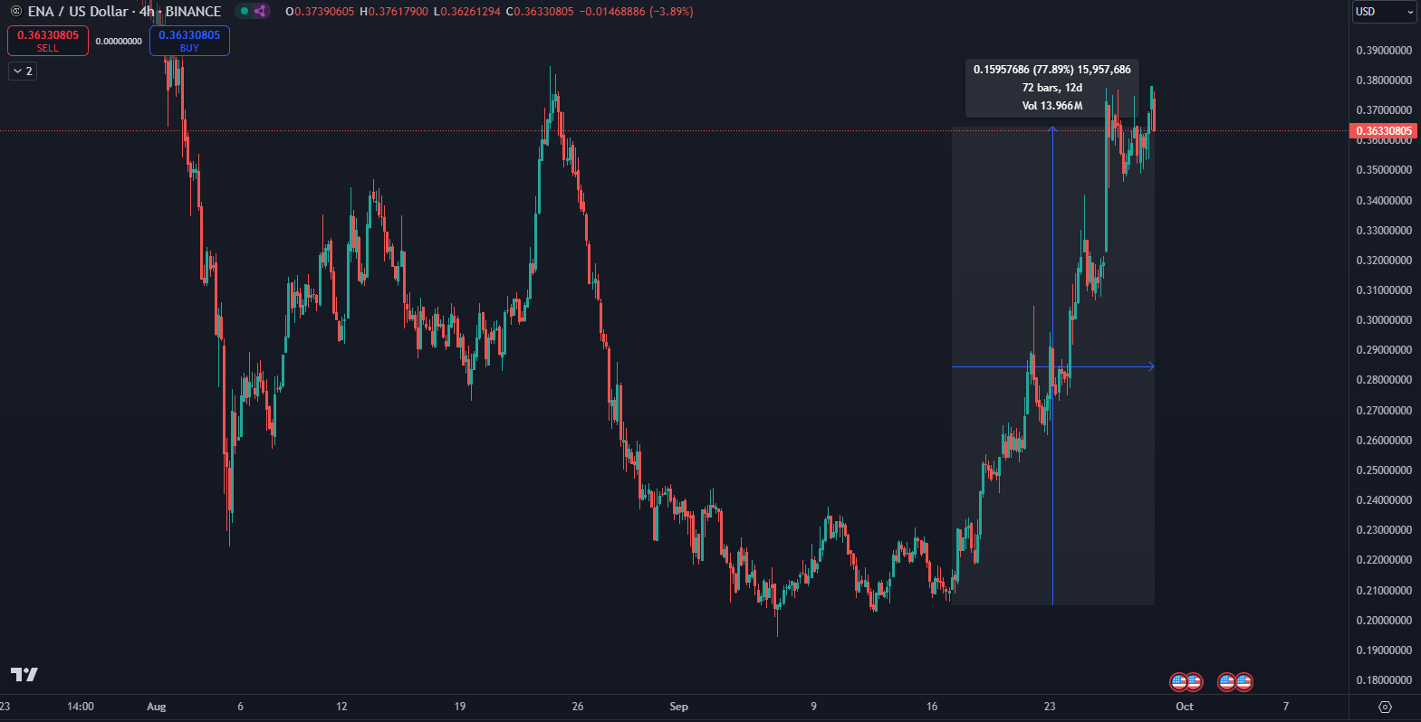 ENA je hneď po meme coinoch najziskovejšou kryptomenou posledného týždňa v rebríčku top 100. Po dlhej korekcii zaznamenala enormný vzostup, keďže stúpla o 78 % len za 12 dní. Ak bude táto dynamika pokračovať, ENA by nemala chýbať v kryptomenovom portfóliu.