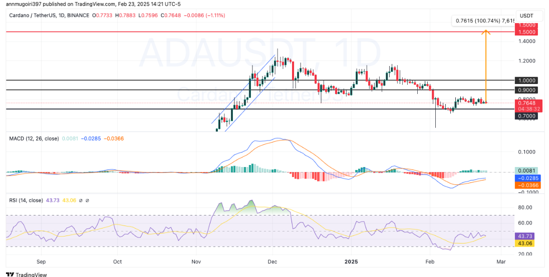Cenový graf Cardana naznačuje potenciálne významné prelomenie, pričom ADA jasne mieri na hranicu 1,50 dolára. V čase písania článku sa ADA obchoduje za 0,77 dolára, pričom za posledných 24 hodín zaznamenala mierny pokles o 1 %. Cenový vzor môže výrazne zvýšiť hodnotu pri prekonaní kľúčových úrovní odporu.
