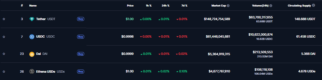 K 2. máju je USDT dominantným stablecoinom, ovládajúcim približne 148,72 miliárd dolárov. Nasleduje USDC s trhovou kapitalizáciou 61,45 miliárd dolárov, DAI s 5,36 miliardami dolárov a USDe s kapitalizáciou 4,67 miliárd dolárov, ukazuje rebríček CoinMarketCap.
