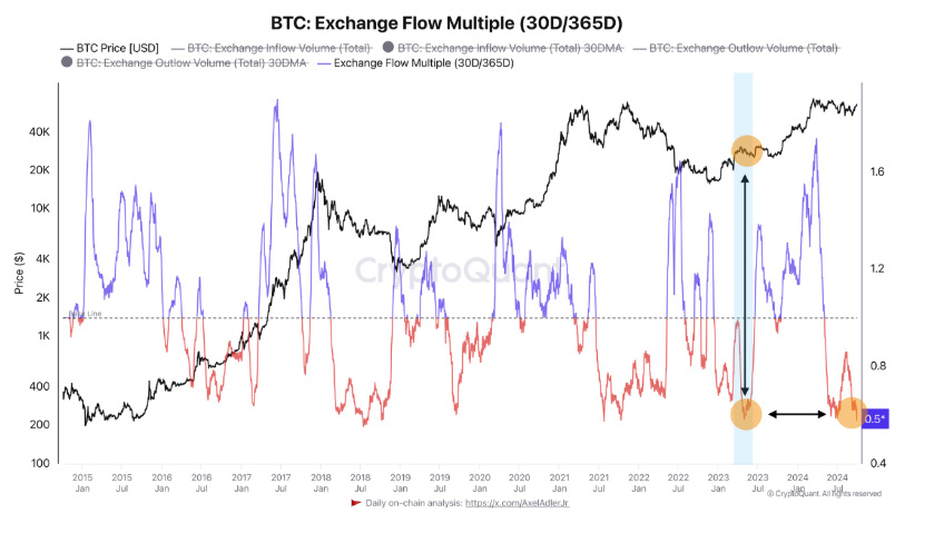 Axel Adler Jr., analytik z CryptoQuant, poukázal na kľúčový indikátor nazývaný „Exchange Flow Multiple“. Tento ukazovateľ meria pomer medzi krátkodobými (30-dňovými) a dlhodobými (365-dňovými) prílevmi a odlevmi Bitcoinu na burzách. Pokles tohto indikátora môže signalizovať zníženie volatility a prípravu trhu na rastúci trend.