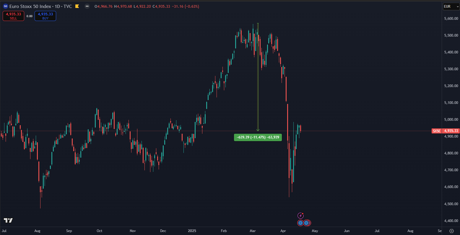 Európske akcie čelia síce miernejšiemu, ale stále citeľnému výpredaju. Index Euro Stoxx 50 sa aktuálne obchoduje o -11,47 % nižšie oproti svojmu vrcholu. Európske trhy sa snažia vyrovnať s globálnou neistotou a slabším makroekonomickým prostredím, ktoré sa zhoršuje v dôsledku oslabenia globálneho obchodu a geopolitických napätí.
