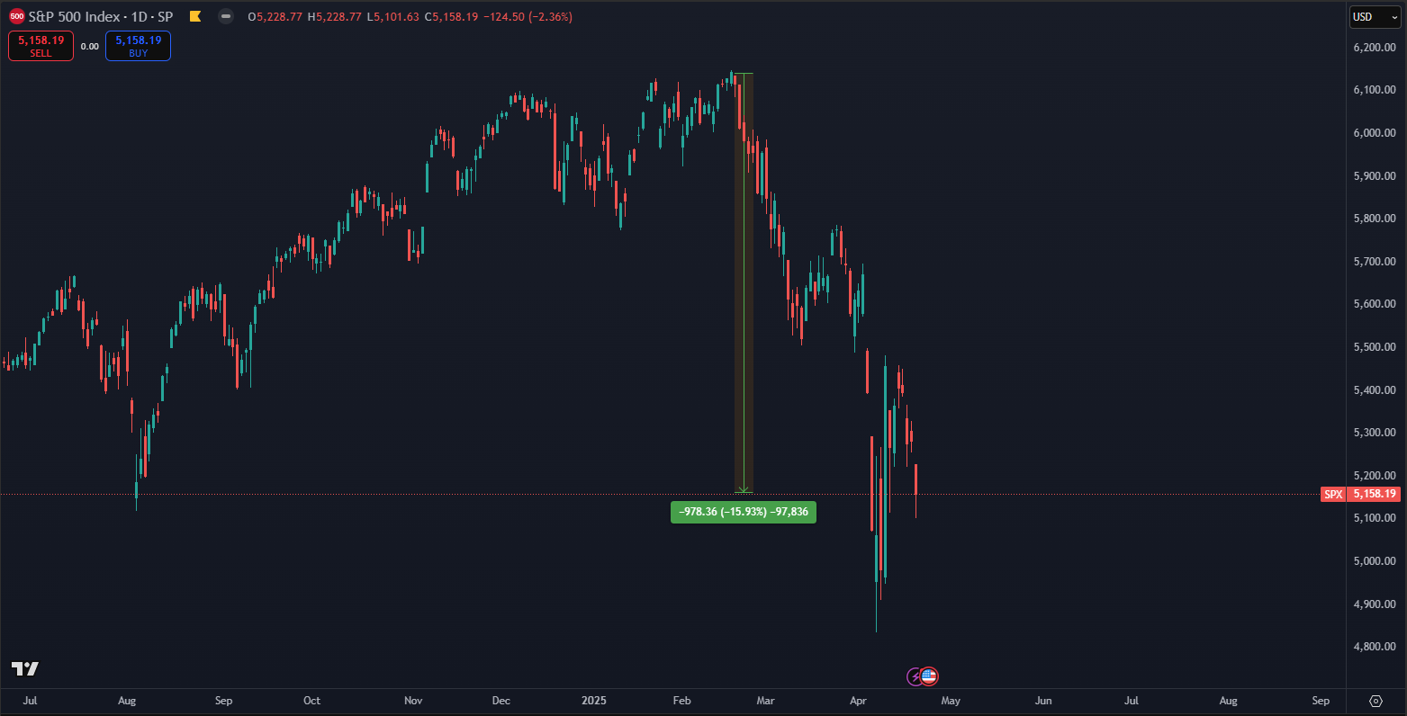 Index S&P 500 sa v čase písania obchoduje o -15,93 % nižšie oproti svojmu historickému maximu z februára 2025. Technologicky zameraný Nasdaq-100 zaznamenal ešte výraznejší prepad a obchoduje sa o -19,87 % nižšie. Tento výrazný pokles podčiarkuje zvýšenú volatilitu v technologickom sektore, ktorý bol v posledných rokoch motorom rastu, no zároveň aj zdrojom väčších rizík.