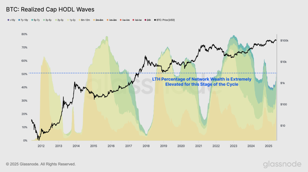 Aj napriek zvýšenému predaju zo strany dlhodobých držiteľov (LTH – Long-Term Holders), ich podiel na celkovom bohatstve siete paradoxne naďalej rastie. Tento jav je nezvyčajný pre neskoré fázy vzostupného trhu, keď dlhodobí držitelia zvyčajne výrazne distribuujú svoje mince. V aktuálnom cykle však dochádza k zvláštnej rovnováhe – veľa mincí sa síce predáva, ale ešte väčší objem starne a vstupuje do kategórie dlhodobo držaných mincí.