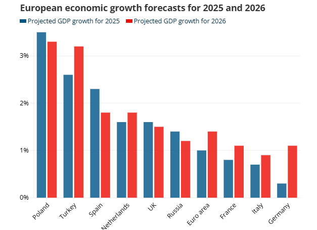 Podľa MMF sa očakáva, že v roku 2025 bude Poľsko rásť o 3,5 % a Španielsko o 2,3 %, čo je podstatne viac ako 1,6 % Spojeného kráľovstva. Aj ďalšie krajiny ako Holandsko (1,6 %) a Turecko (2,6 %) majú lepšie alebo porovnateľné predpoklady rastu.