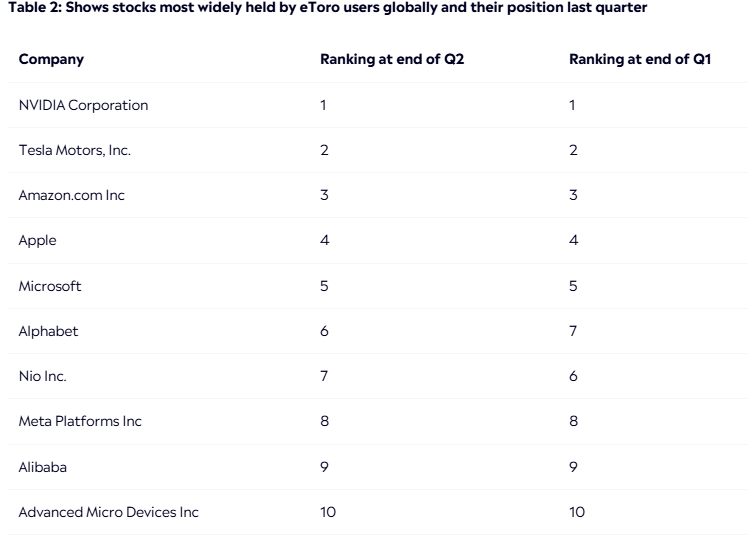 Zaujímavé je, že zoznam 10 najdržiavanejších akcií na platforme eToro sa príliš nezmenil. Jedinou výnimkou bolo prehodenie pozícií Alphabetu a Nia. Nvidia, Tesla a Amazon zostávajú stabilne na prvých troch miestach. To poukazuje na dlhodobú dôveru investorov v tieto technologické giganty, aj napriek volatility.