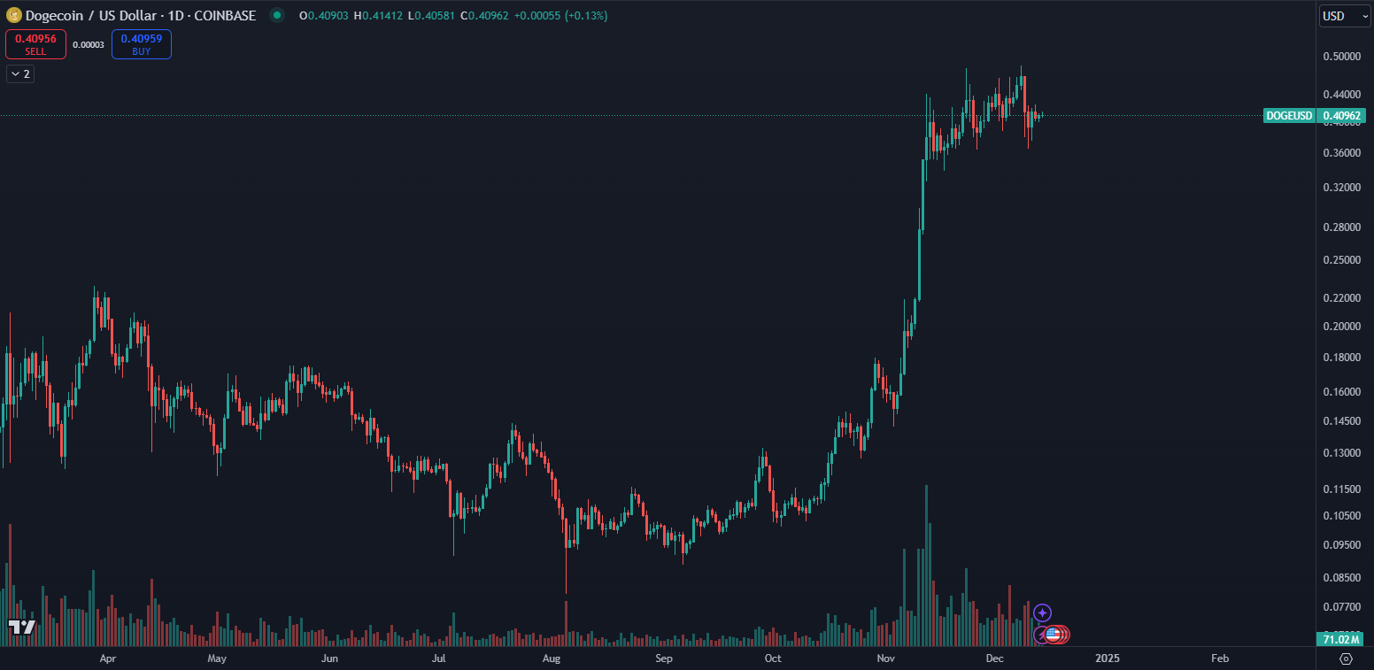Dogecoin exponenciálne stúpa. Zdroj: TradingView