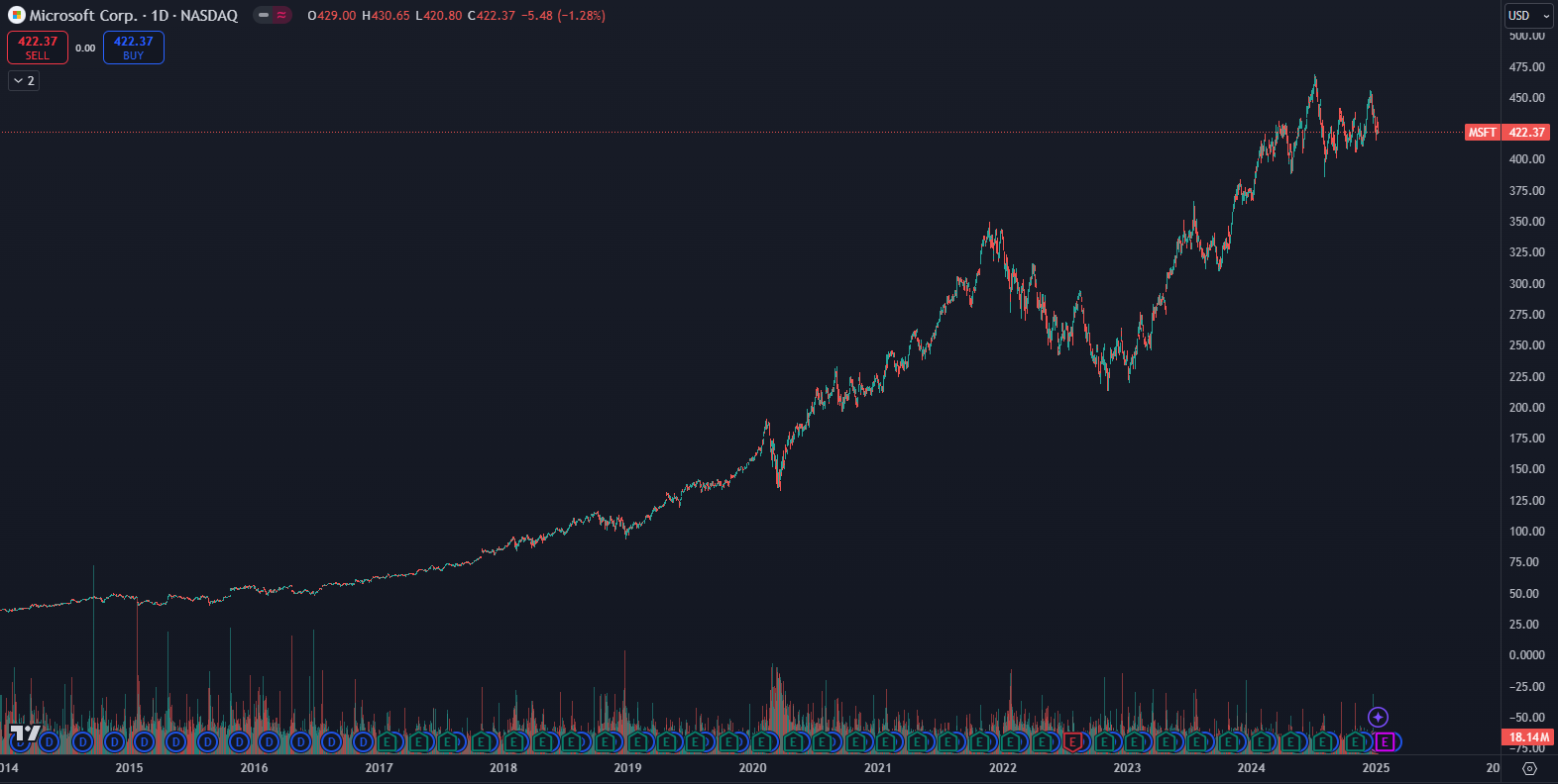 Akcie MSFT sa nachádzajú v rastúcom trende už 800 dní, počas ktorých vytvorili zhodnotenie o 100 %. Za posledných 10 rokov dokonca akcie stúpli o 1 100 %. Ak bude tento trend pokračovať aj v roku 2025, Microsoft prinesie investorom vysoké zhodnotenie.