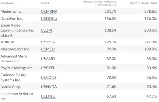 Nasledujúca tabuľka zobrazuje 10 najsilnejších akcií v prvých 150 dňoch pandémie: