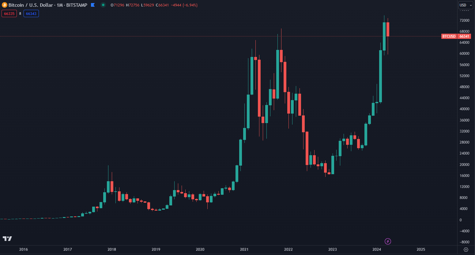 Bitcoin síce v roku 2022 počas vysokej inflácie vytvoril korekciu až o vyše 70 %, no pozrime sa, kde je dnes. Podobné korekcie sme v minulosti videli hneď niekoľkokrát, no vždy sa spamätá a prekoná historické maximum. V súčasnosti sa obchoduje už na cene vyše 66 000 dolárov a nedávno dosiahol vrchol na cene takmer 74 000 dolárov.
