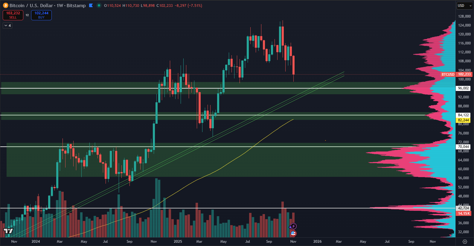 Druhou úrovňou, ktorá by mohla pôsobiť ako stabilizačný prvok, je 82 000 dolárov. V prípade, že sa trh prepadne hlbšie, na tejto hladine sa nachádza 100 SMA (kĺzavý priemer) na týždennom grafe. V minulosti túto úroveň niekoľkokrát BTC úspešne otestoval, pričom aj tentoraz by mohla poslúžiť ako silná opora. Okrem toho sa v okolí 82 000 dolárov nachádzajú zvýšené objemy obchodov, čo naznačuje silný záujem investorov o túto cenovú zónu.