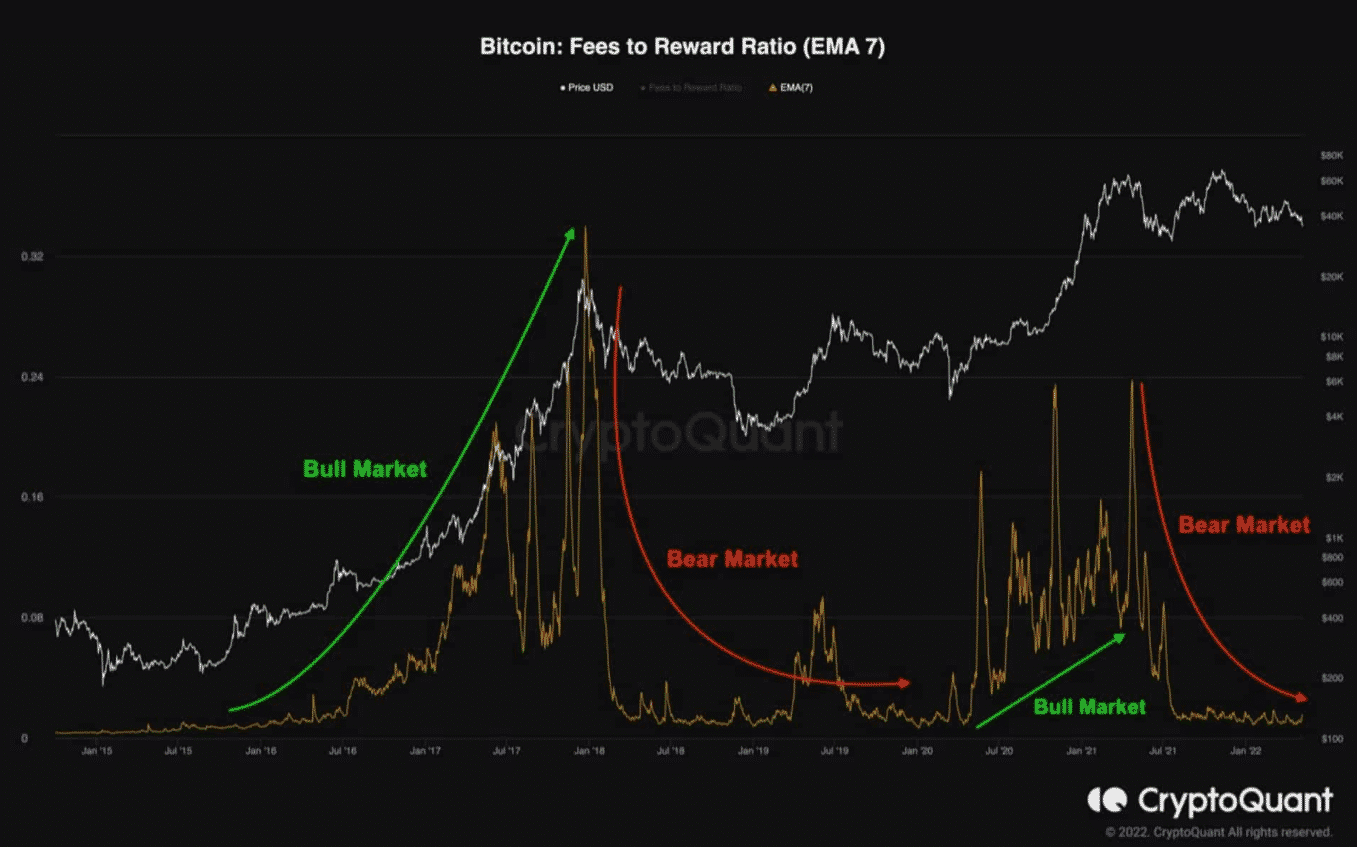 Ďalšou metrikou, ktorú treba zvážiť, je pomer poplatkov k odmene. Údaje ukazujú, že od predchádzajúceho historického maxima výrazne klesol, čo je podľa analytikov náznak medvedieho trhu. Medzitým počet adries v strate upravený o 7-dňový kĺzavý priemer tiež dosiahol 2-ročné maximum.