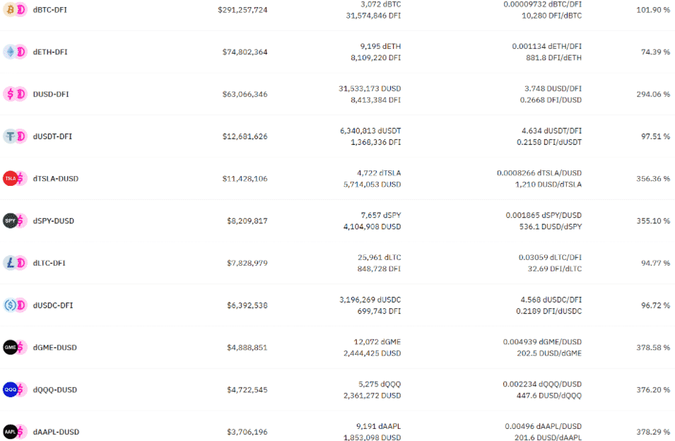 DeFiChain páry v DEX poole. Zdroj: DeFi Scan