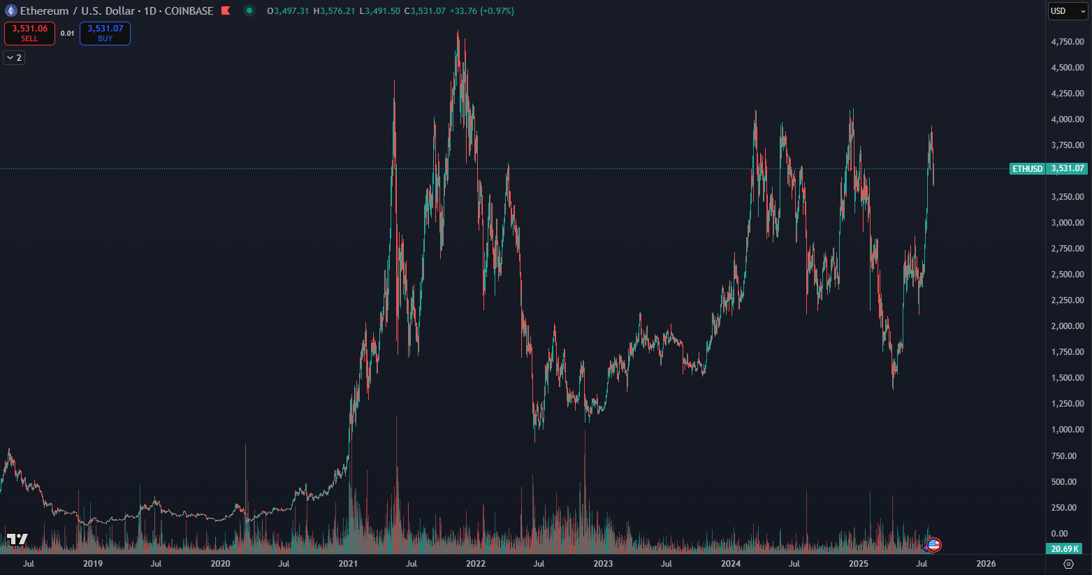 Podľa údajov CoinMarketCap sa Ethereum v čase písania obchoduje za 3 530 dolárov s trhovou kapitalizáciou 426 miliárd dolárov. Denný objem obchodovania dosahuje približne 21 miliárd dolárov, čo predstavuje 5 % z celkovej trhovej hodnoty a naznačuje silnú aktivitu investorov.