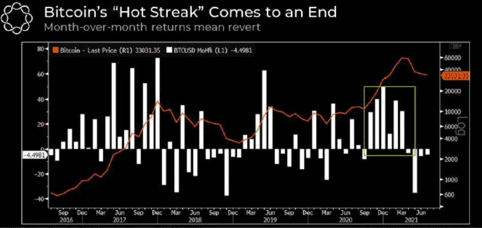 Nižšie uvedený graf ukazuje, že Bitcoin zaznamenal šesť po sebe nasledujúcich mesiacov cenových ziskov pred poklesom.