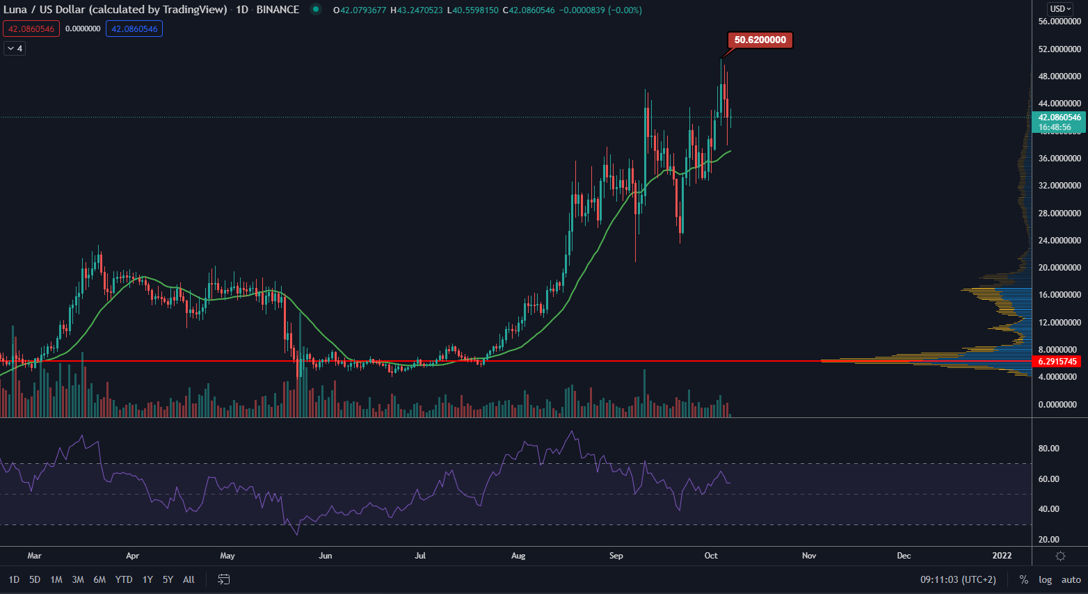 Údaje z TradingView ukazujú, že po dosiahnutí minima 23,81 dolára 21. septembra sa cena tokenu LUNA prudko zvýšila o 117 %, aby sa 4. októbra vytvorilo nové rekordné maximum na úrovni 50,62 dolárov. Jeho 24-hodinový objem obchodovania sa zvýšil na 2,5 miliardy dolárov.