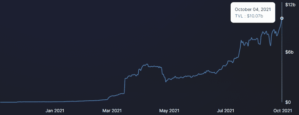 Podľa údajov spoločnosti Defi Llama dosiahla celková hodnota aktív zamknutých v sieti Terra 4. októbra rekordných 10,07 miliardy dolárov práve vtedy, keď sa cena tokenu dostala na nové rekordné maximum.