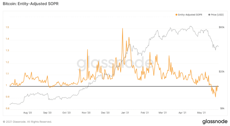 Ďalej metrika známa ako „Bitcoin Entity-Adjusted SOPR” (spent output profit ratio) ukazuje, že trh už nepredáva Bitcoiny so stratou a pomaly sa otáča.