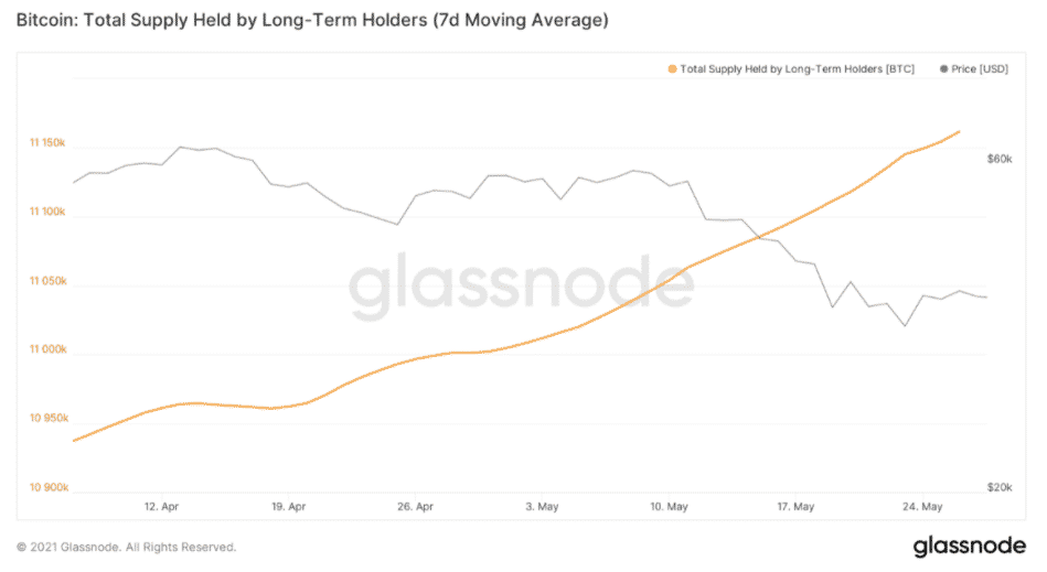 Ponuka bitcoinov v držbe dlhodobých držiteľov sa v priebehu májového krachu neustále zvyšovala. Zdroj: Glassnode